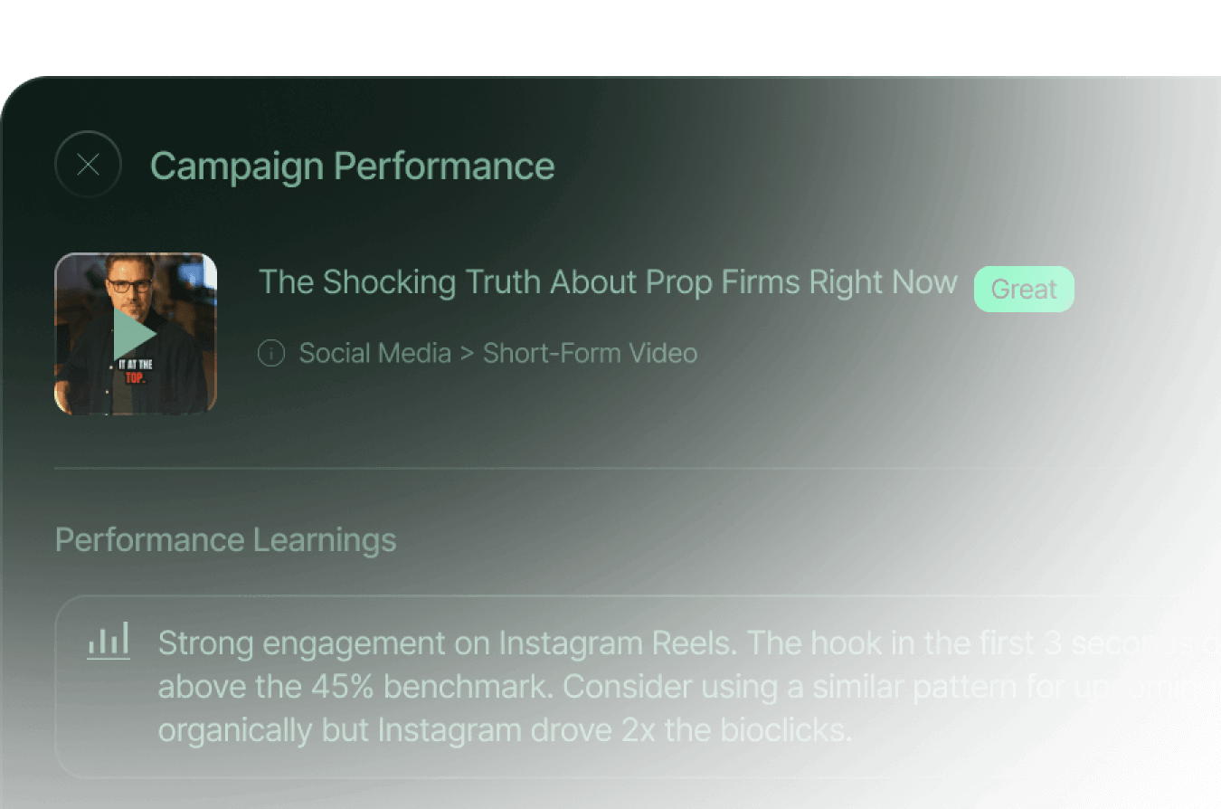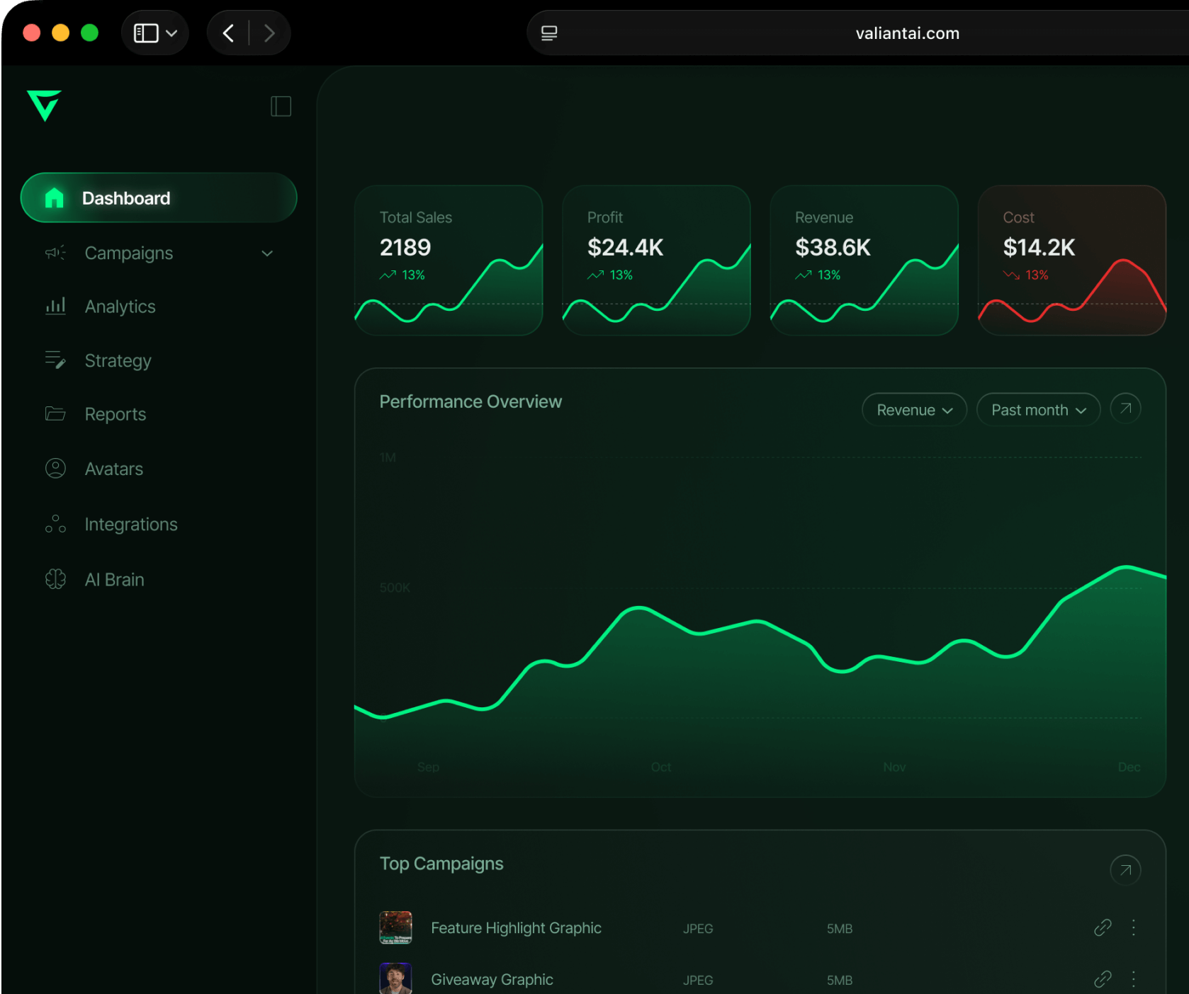 ValiantAI analyzes every campaign, compares what changed to how performance shifted, and generates learnings that improve the next iteration. The platform has an elephant memory—it never forgets. Every data point feeds back into a continuous performance loop where the AI gets sharper and more effective over time.