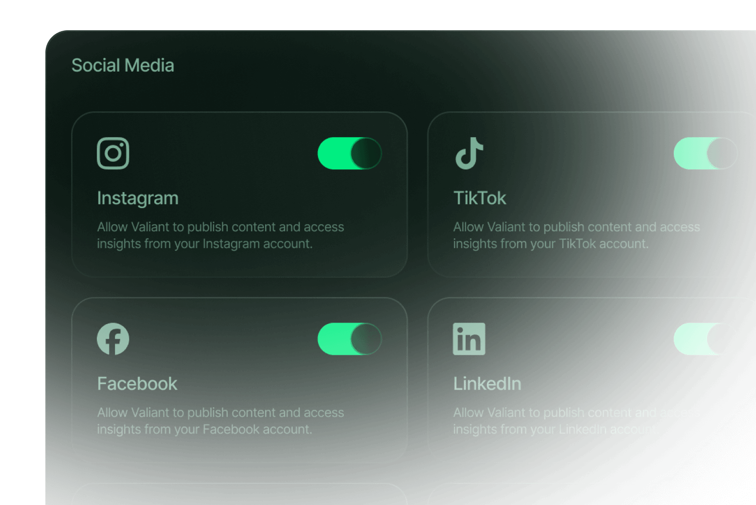ValiantAI integrates with over 300 platforms across CRMs, social channels, ad accounts, and email providers. Real-time data syncing, autonomous publishing, and centralized management—all from one place.