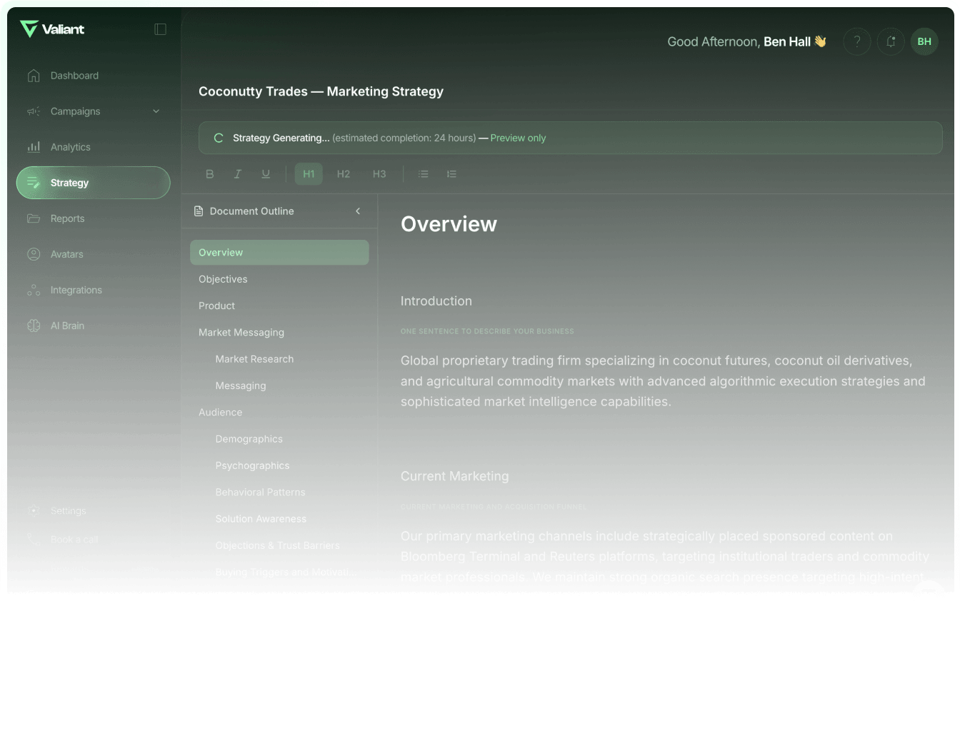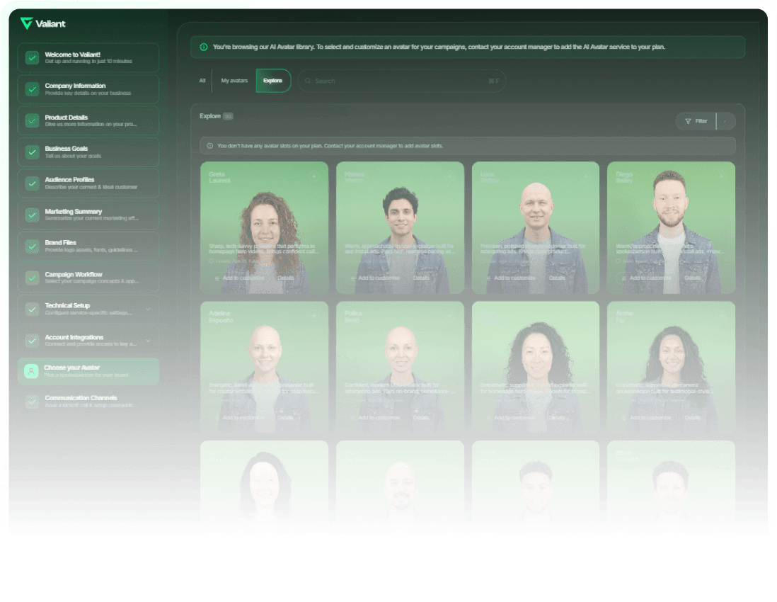 Not at all. ValiantAI is designed for marketers, not engineers. Simply input your business fundamentals, connect your channels, and our AI handles everything else. No coding, no complex prompting, no technical expertise required. If you need help, our dedicated strategists are always available.
