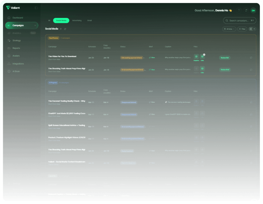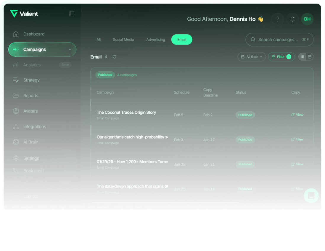 Every ValiantAI customer gets a dedicated marketing strategist and account manager. Our team of 20+ marketers—who until recently ran a full-service agency—reviews every campaign before you see it. You get AI speed with human quality control, ensuring professional standards without lifting a finger.