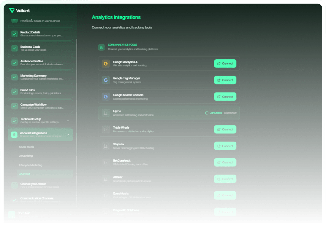 ValiantAI tracks over 300 performance metrics across every campaign, channel, and creative asset—all in one place. Get real-time visibility, weekly AI-generated insights, and automated monthly reports without logging into multiple platforms.